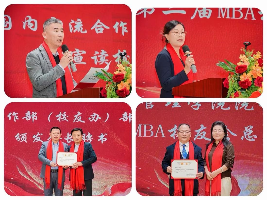 国内交流合作部(校友办)副部长韩骏宣读了校友会换届批复文件,李群生宣读了新聘任MBA校友会总顾问、顾问名单,随后聘任仪式依次举行:工商管理学院副院长薛继东为副秘书长、各部部长颁发聘书;工商管理学院党委副书记周志刚分别为常务副会长、秘书长、副会长颁发聘书;工商管理学院院长郭淑芬为新聘任的MBA校友会总顾问、顾问颁发聘书;董军伟为第二届MBA校友会会长颁发聘书。一张张聘书,既是一份荣誉,更是一份责任,承载着母校对校友的信任,也凝聚着校友对服务母校、回馈社会的担当。