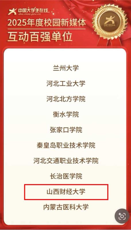 1月8日,教育部中国大学生在线正式公布2025年度校园新媒体融合共建表彰名单,我校凭借扎实的网络育人成效与亮眼的互动传播表现,喜获“2025年度校园新媒体互动百强”荣誉称号,彰显了学校校园新媒体建设的显著成效与广泛影响力。