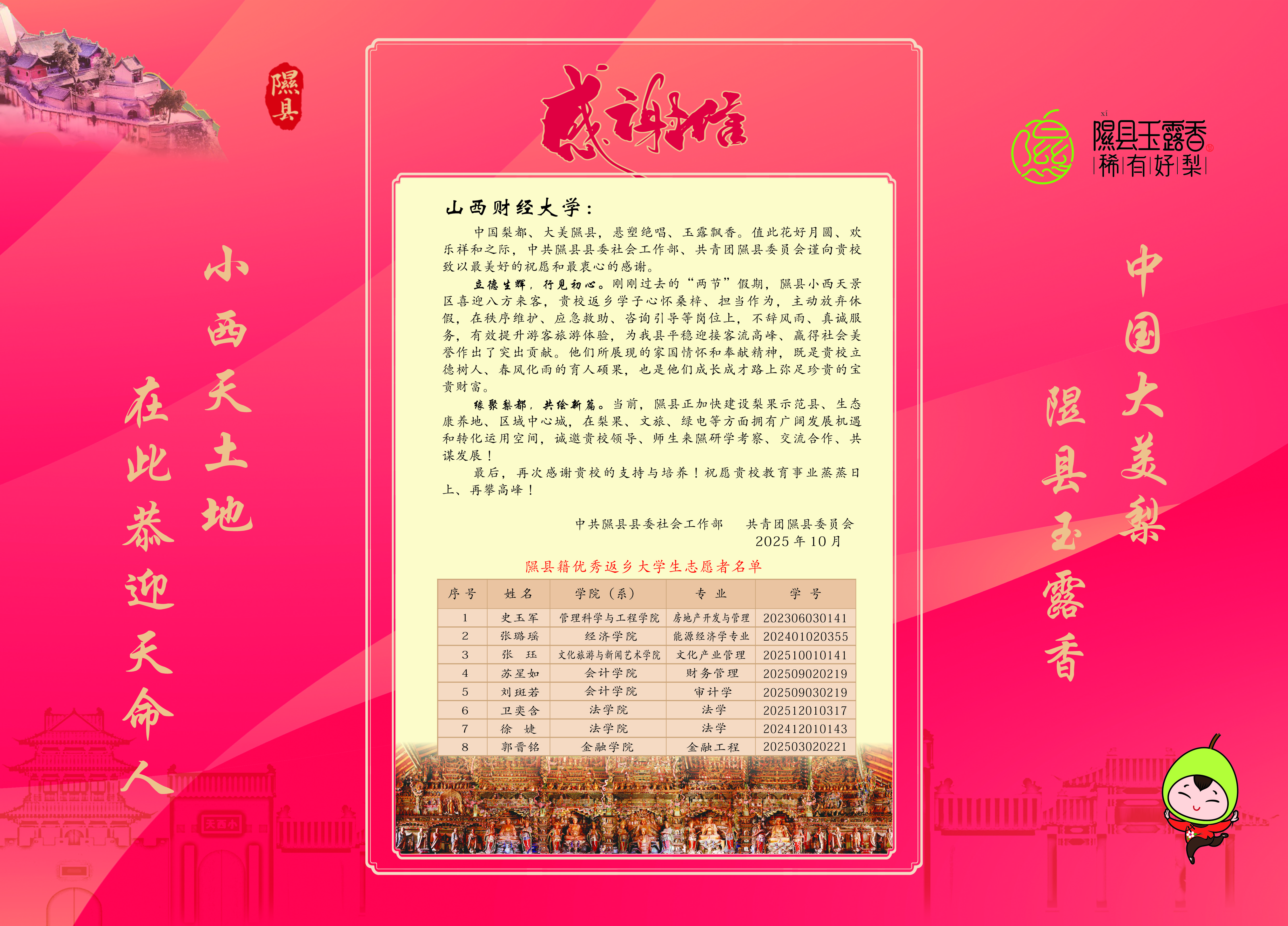 近日,我校收到来自中共隰县县委社会工作部、共青团隰县委员会的感谢信。信中对在2025年“两节”假期期间,主动投身隰县小西天景区志愿服务的我校8名返乡学子提出高度赞扬和衷心感谢。